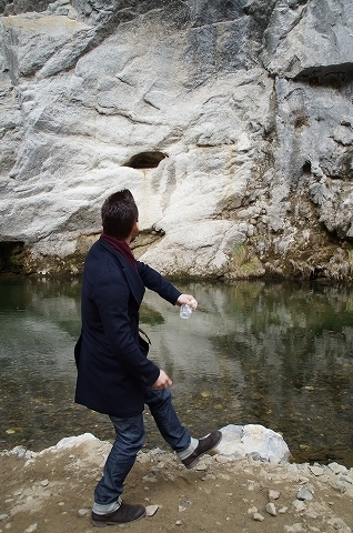 「向かいの壁にある穴、見えますか?」と船頭さん。なんでも、幅10mほどの川を挟んだ向こう側の壁にある穴へ軽石を5回投げるとの事、それぞれに願いを掛けて、入れば叶うのだという。「やろうよ!」と乗り気なヒデさんがまず挑戦。なんと、一発目から入ってしまう…。