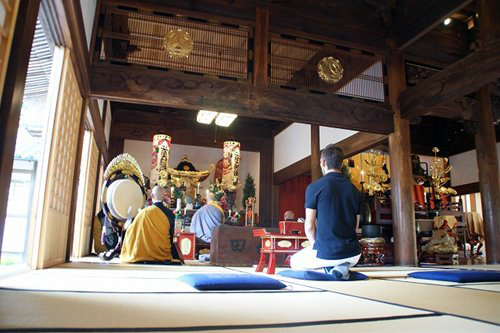 こちらでは毎朝40分から50分も坐禅をするとの事、ヒデさんも正しい座り方を教わる。以前、石川県の総持寺祖院にて座り方を教わった事があるのだけど、今回は石川にはあった坐蒲(ざふ:高さのある座布団のようなもの)がない。ヒデさんの後ろで真似をしてみる。背筋を伸ばす。やはり正しい姿勢をとる事はキツい。その上、足を組んでみる。痛い。