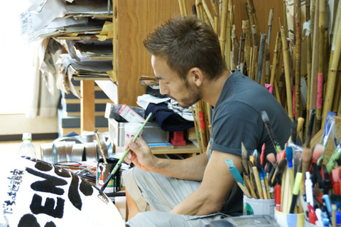 翌日は中州川端通りにある門田提灯店へ。ここでヒデさんは提灯作りに挑戦。ここでは特別に、居酒屋さんより実際に発注された店頭提灯の筆入れを手伝わせて頂けるとの事。
