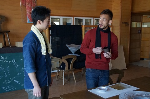それから僕らは朝日町へ移動、金工の牧野広大さんを訪問。牧野さんは愛知県の出身なのだけど、「住んでいた所には何かのチェーン店やコンクリートのマンションしかないような場所でした。それに比べてここにはキレイな水と空気がありますから。」との事で、こちらに移住し、廃校となった小学校の一室に工房を構え、創作活動をされている。