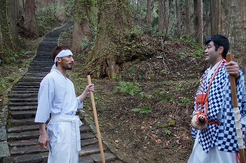 3日目、まずは朝の7時より羽黒山の出羽三山神社へ。雨が降ったり止んだりの中、ヒデさんは白装束に着替えて山伏と2000段の階段を上る事に。