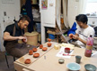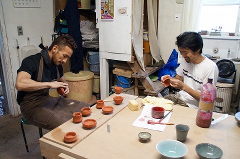 ヒデさんも、釉掛けを体験させてもらう。中村さんの、「沢山まわられて、目もとても肥えたんじゃないですか?」という問いに、ヒデさんが答える。