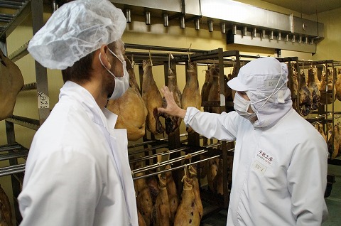次の訪問先は平田牧場。たった2頭の豚から始まったというこちら、直営・グループを合わせると今では年間約20万頭を出荷出来るほどの規模になられたという。まずはお肉の加工場、ハムやソーセージの加工場などを見学。すごい量のお肉が、ここで加工されて全国に出荷されているのだ。