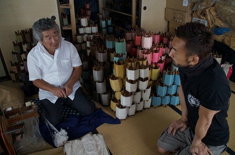 6日目、まずは染織の山岸幸一さんを訪問。山岸さんが染織を始められた頃の着物を見せてもらう。ヒデさんが寡黙に数十秒眺めている横で、僕も近づいてしっかり見ていると、「草木染めの良さは、古くなっても古くならないんです。」と山岸さん。矛盾しているようなその言葉だけど、考える程にとても的確に表現された言葉だとわかる。山岸さん、以前は化学染料を使った時期もあったとの事。