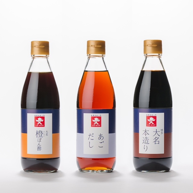 博多大名本造り、あごだし、大名橙ぽん酢の各1本の味彩セットになります。