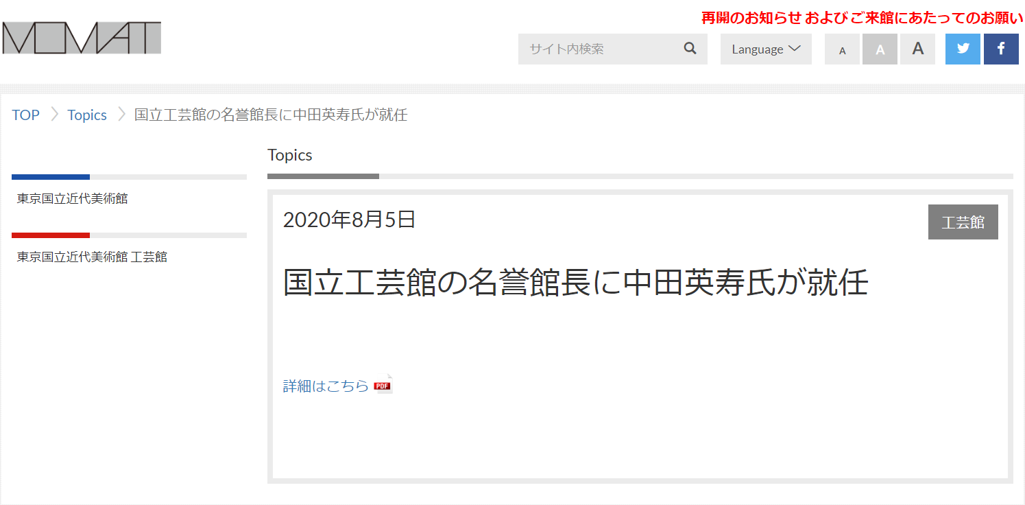 東京国立近代美術館工芸館 名誉館長就任のお知らせ