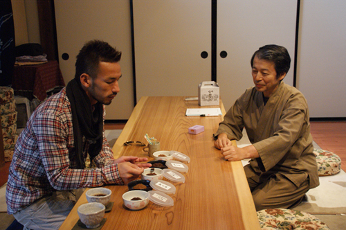 味噌汁が大好きなヒデさん。まずは米味噌1年、昔造り味噌2年、こだわり味噌2年などを味噌のまま試食。「麹、塩、水、大豆…それらをどう調合するかです。」と星野さん。