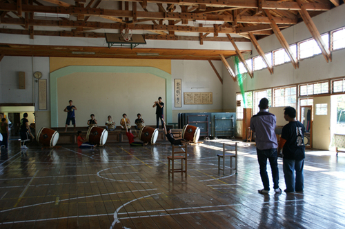 佐渡へ到着後、まずは鼓動文化財団の研修所へ。海沿いの道から山道へと入り、細くくねくねした道路を進むと研修所へ到着。山と海に囲まれた広い運動場に昔ながらの校舎のような建物。元々中学校だったとの事だけど、今ではここで数十人の若者が鼓動の研修を受けている。体育館の中から、何か地鳴りのような音が聞こえる。聞こえる、というよりは、胸を軽く連打されるような感じだろうか。