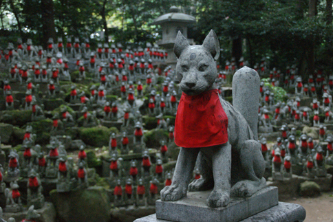 敷地もとても広いのだけど、何よりも奥にある霊狐塚に驚かされる。無数の狐の石像がそれぞれ赤い前掛けをして乱立するその様は、一見、異様でもあるのだけど、近づいてみるとそれぞれがなんともかわいくも見える…。これにはヒデさんも多少は驚いていたようだ…。