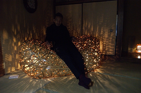 一角に、竹で作られたソファを発見。部屋の電気を消すと、中の電気の灯りが縫い込まれた竹の隙間を通って神秘的な光りを放つ。ヒデさんが恐る恐る座ってみる。