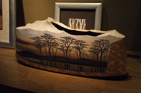 佐伯さんの作品にある絵は、まるで描かれているように見えるのだけども、それらは彫った所に違う種類の土を指で嵌め込み(象嵌)してあるもの。異なる色土は窯に入れた時の収縮率も違うそうで、相当な試行錯誤をされた事は間違いない。