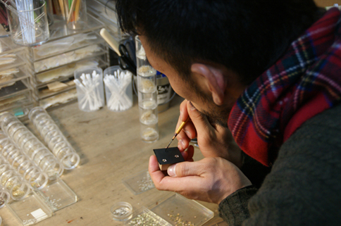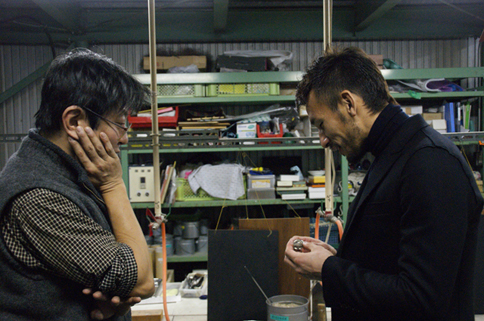 見せて頂いた三好さんの作品の印象は、どこか都会的。高層ビルの灯りを螺鈿(らでん)という技法で巧みに演出されていて、一度見入ってしまったヒデさんも数分間、色んな角度から自分なりの検証をしていた。