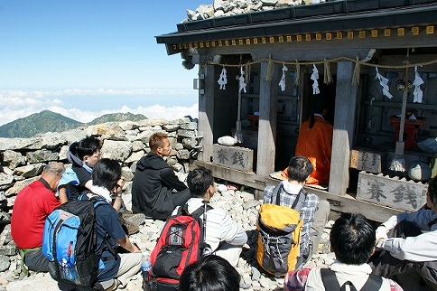 程なくして前田さんと大島、渡邊さんも登頂。峰本社にて神職の方に祝詞(のりと)を奏上して頂いた。