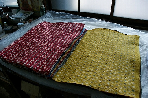工房を見せて頂くと、モダンな感じのするデザインの和紙があちこちにあるのが目につく。ヒデさんも物珍しそうにそれらを見て、「ランチョンマットなんかでこんなのあったら面白いですよね。こんな赤なら、白いお皿もすごく映えそうだし。」と吉田さんと話が弾んでいた。