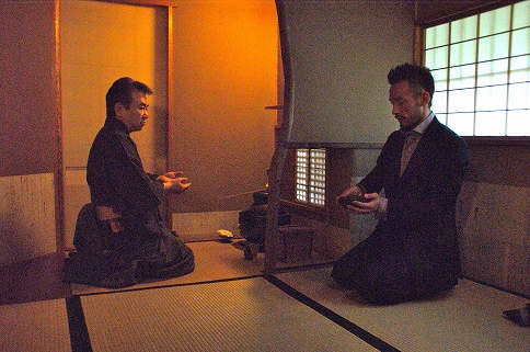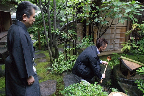 小堀さん、羨ましいほどに着物がよく似合う、まさにダンディな方。まずは寄り付きと呼ばれるお部屋にて、扇子とふくさをヒデさんの為にご用意頂いていた。茶道における扇子の意味など、小堀さんに細かく教えて頂く。それからお茶室へと行く途中に、心地よい茶庭を通る。ヒデさんもとても気持ちが良さそうな表情を浮かべる。