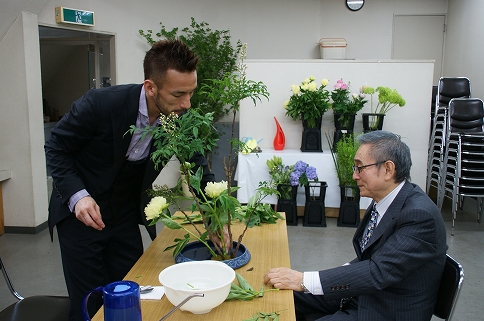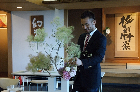 ヒデさんもいけ花に挑戦。ところどころで、粕谷さんより1本1本の長さなどの細かいアドバイスを頂いていたのだけど、いけ終わってから、ヒデさんが頷きながらこう話す。