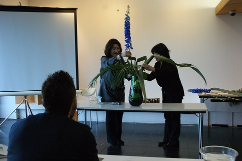 贅沢にも勅使河原さんにいけ花のデモンストレーションをやって頂く。何もなかったところに、次々と花がいけられ、形を成して行く。勅使河原さんの、花を優しく見る目が印象的だった。