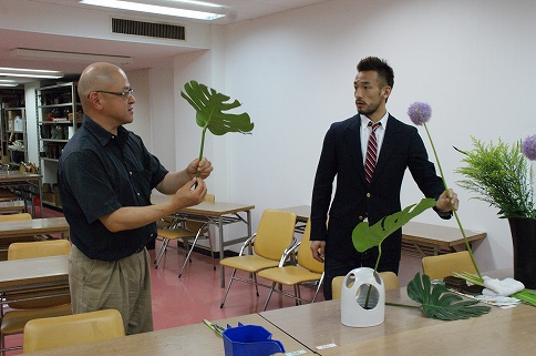 ここでもヒデさん、いけ花に挑戦。横から見ていると、花を選ぶのに悩んで、決めて、今度はカットする長さに悩んで…と、悩みの連続のように思える。