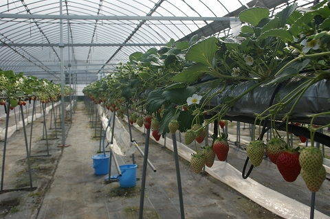 話を聞くと、こちらではいちごの栽培もされているらしく、農園を見せてもらう事に。徳島で行ったいちご農園となんとなく違うな、という印象を受けた僕ら。よく見ると、いちごが地面ではなく、高い台からぶら下がっているではないか。