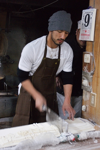エプロン姿のヒデさんが、生地を足で踏み踏みしてコネ、それを今度は棒を使ってのばし、そして最後に包丁で麺の太さに細かく切る、という行程を1時間以上かけてこなした。